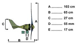 Vjetrogenerator dolazi u kompletu sa kontrolom punjenja baterija te je izuzetno jednostavan za montažu. Težine od svega 5 kg vjetrogenerator je moguće montirati uz bok kuće na stup promjera 4cm.